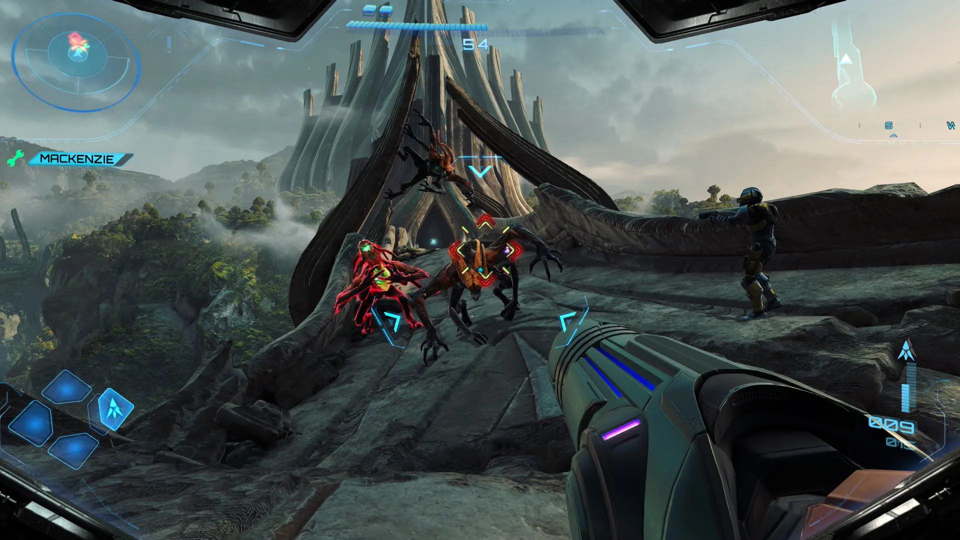 Zum vieldiskutierten Thema Galaktischen Föderation: Miles MacKenzie, trifft man zu Beginn, und er begleitet einen gefühlt etwa 15 Minuten als eine Art Tutorial-Charakter. Danach zieht er sich in ein provisorisch errichtetes Lager zurück und funkt Euch hin und wieder an. Mich hat das nicht gestört. Im weiteren Verlauf trifft man auch auf weitere Föderationssoldaten. Entgegen der Meinung vieler im Netz empfand ich das als erfrischend. Das bringt mich persönlich der Lore etwas näher. Einzig dass Samus dabei nie spricht oder kaum reagiert, wirkt manchmal etwas seltsam.