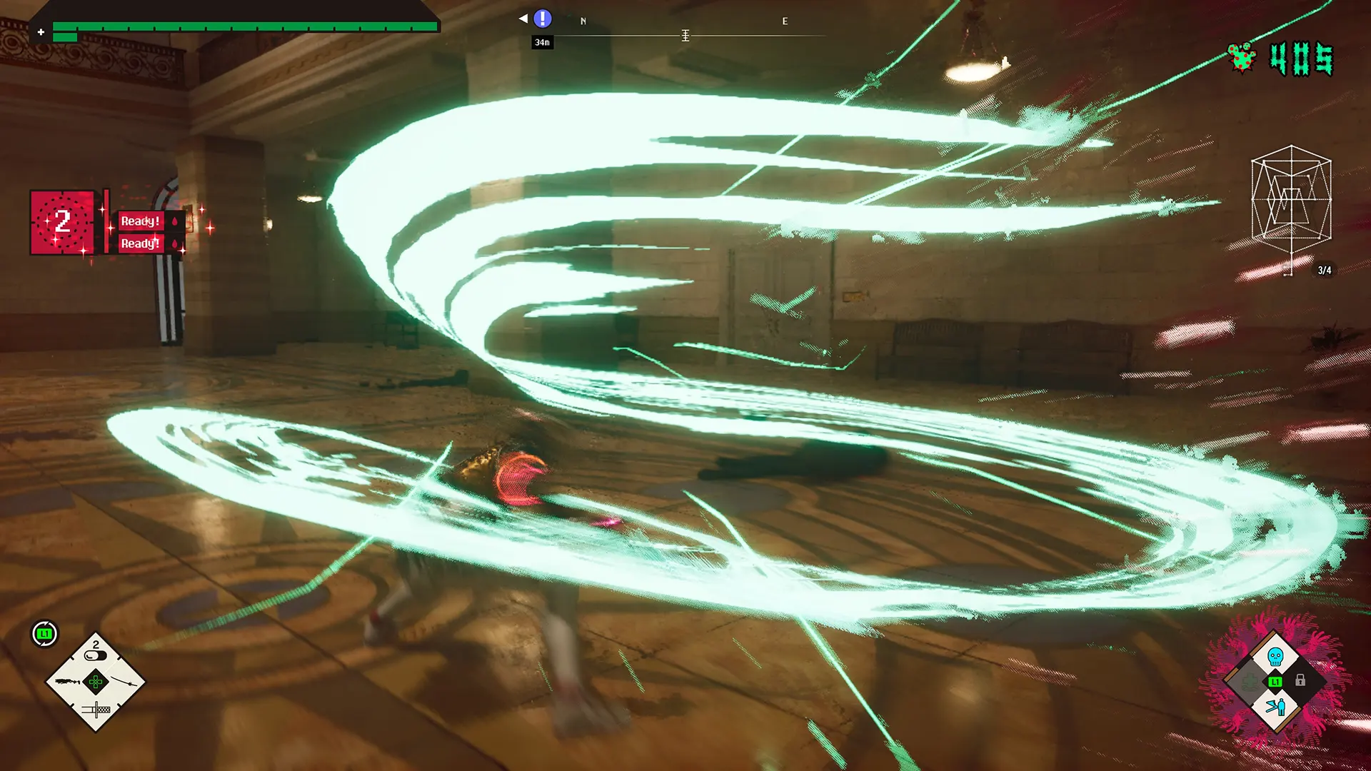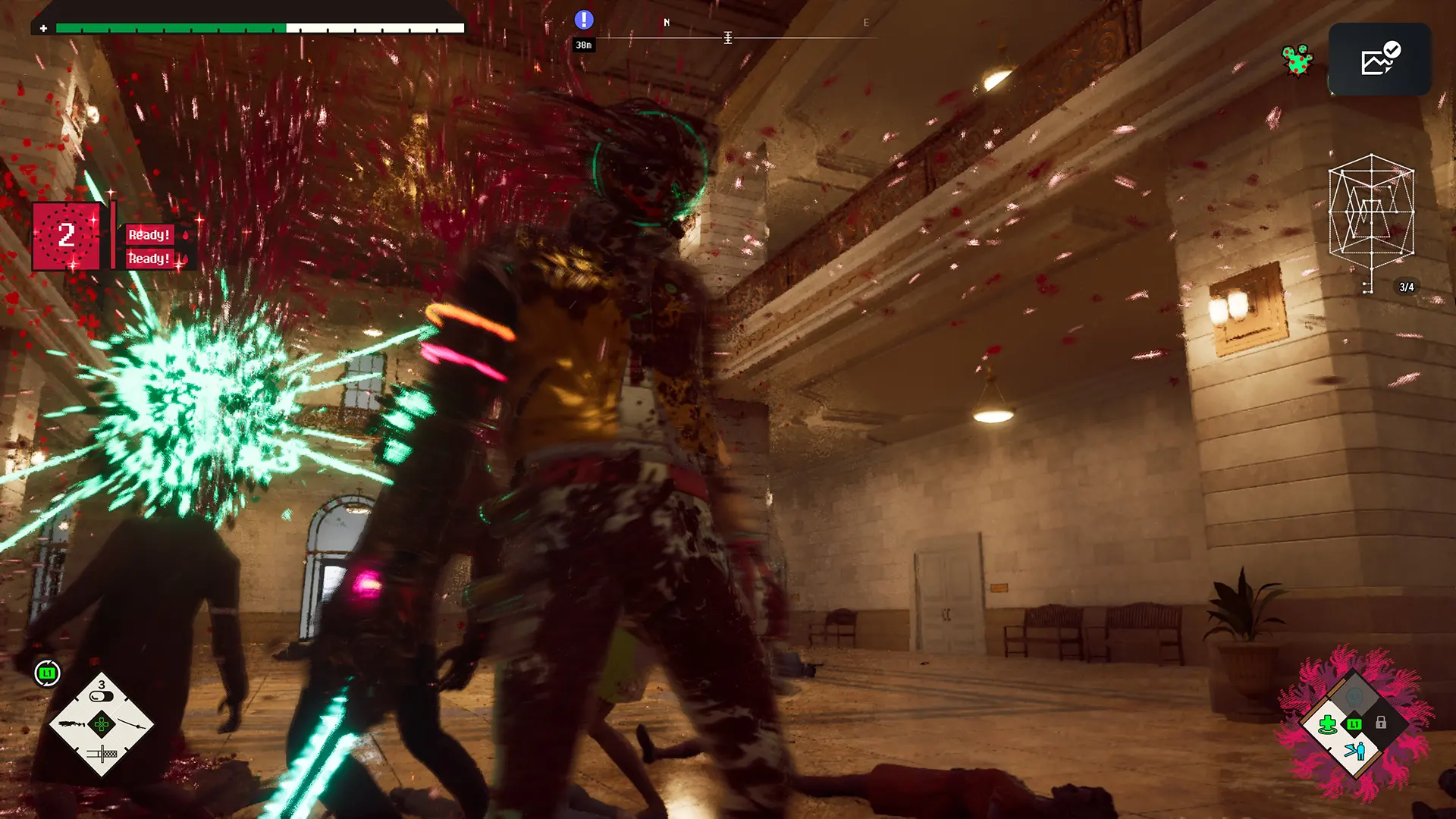 Hierfür stehen Euch jeweils vier Nah- und Fernkampfwaffen zur Verfügung, die Ihr zügig freischaltet. Das bietet Euch sehr schnell die Möglichkeit, die Waffen eurer Wahl zu priorisieren und dementsprechend aufzuleveln. Von Cyber-Katana bis hin zu Hyper-Boxhandschuhen ist alles dabei. Dazu kommen Lock-On, Ausweichrolle und ein verheerender Bloody-Summer-Angriff, den Ihr mit gesammeltem Blut aufladen könnt.