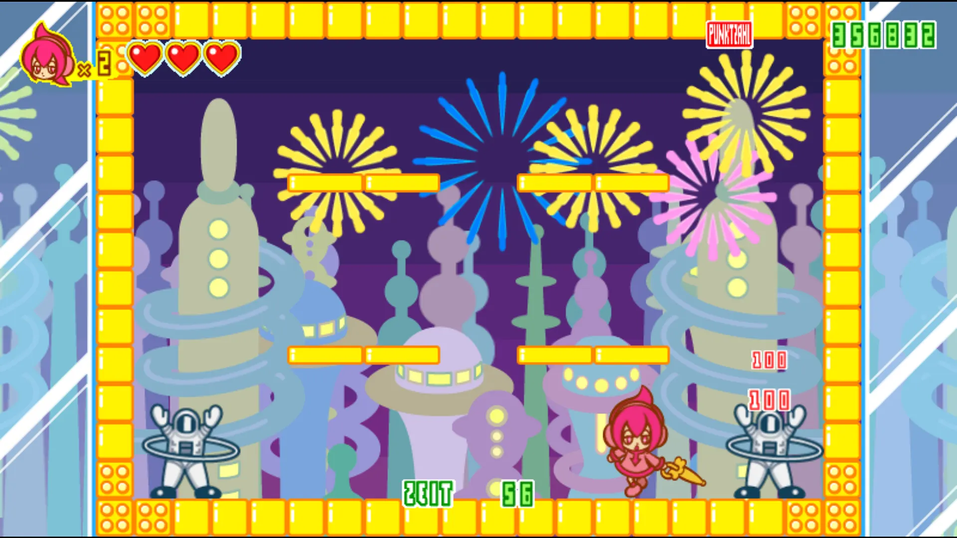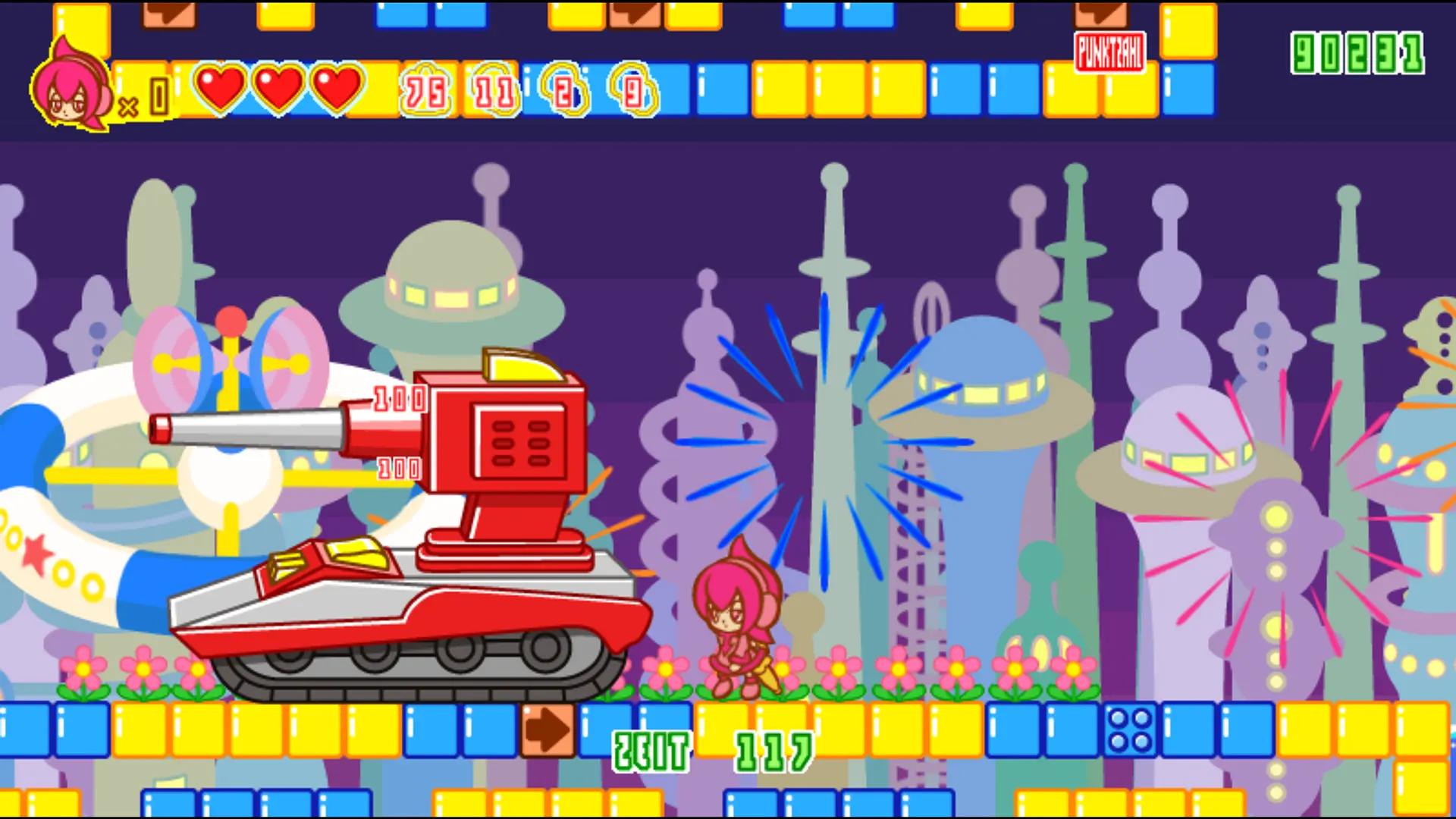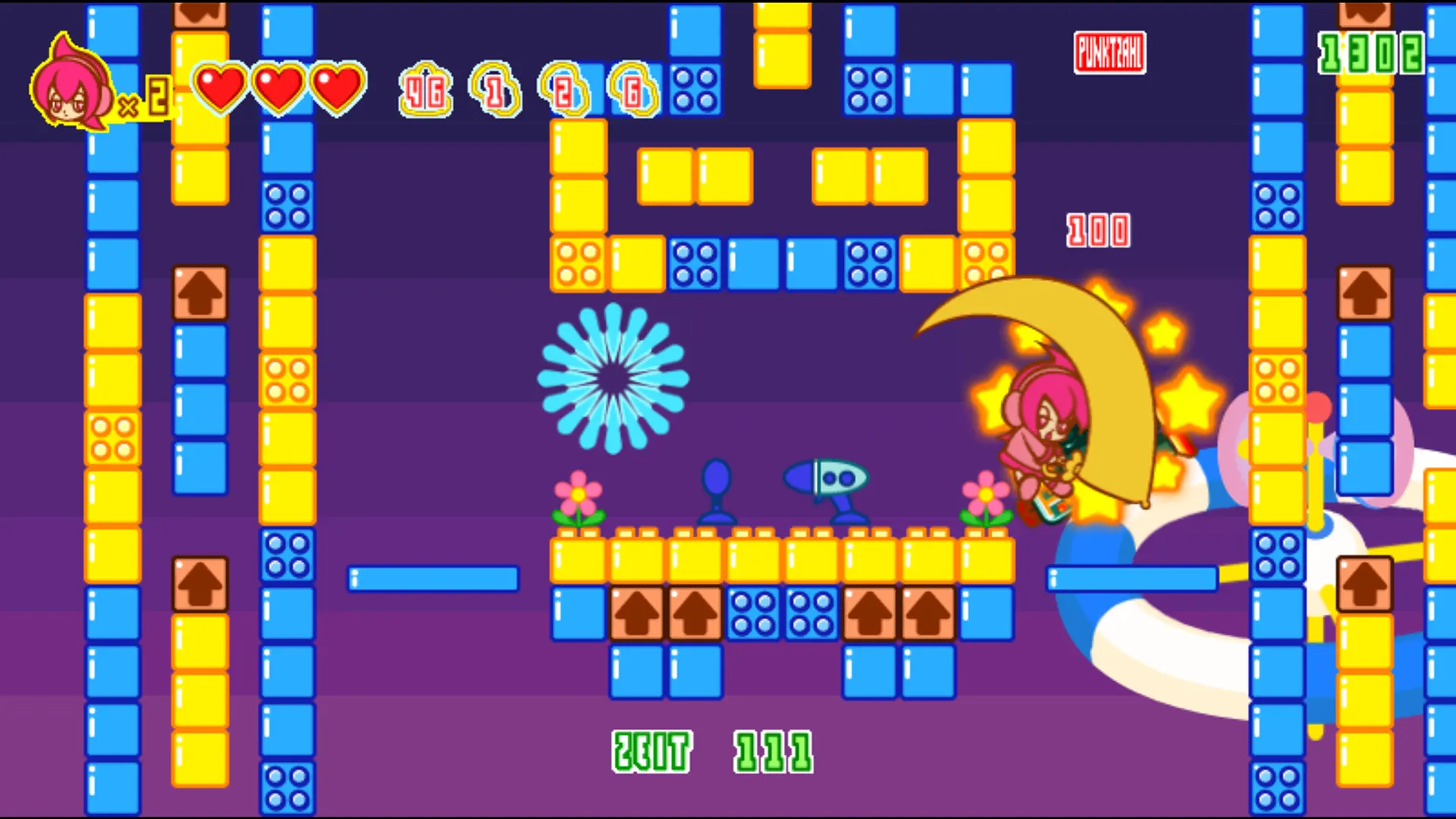 Spica kann springen und mit ihrem Regenschirm hauen – ja richtig, wir haben hier einen klassischen Zweiknopf-Plattformer wie aus der NES-Hochzeit, der es über den 2000er-Arcade-Umweg auf aktuelle Systeme geschafft hat. Bei näherer Betrachtung erschließen sich zudem allerlei Feinheiten. Spica kann ihren Schirm aufspannen und in Aufwinden gleiten. Im Wasser wird der Schirm zum praktischen Boot. Wird der Schlag-Knopf im Stand gedrückt gehalten, wird der aufgespannte Schirm zum Schild und wehrt feindliche Projektile ab Auch bei "Duck Tales" auf dem NES hat Spica gelernt. Der Schirm taugt als Pogo-Stock wenn Spica Gegnern auf die Rübe springt und wird zum Golfschläger, wenn sie sich duckt. Weggeschleiderte Gegner können krasse Combos auslösen, die den ganzen Bildschirm in flammen setzen. Steckt sie den Schirm in Wämde, kann sie sich in neue Höhen kataputieren.