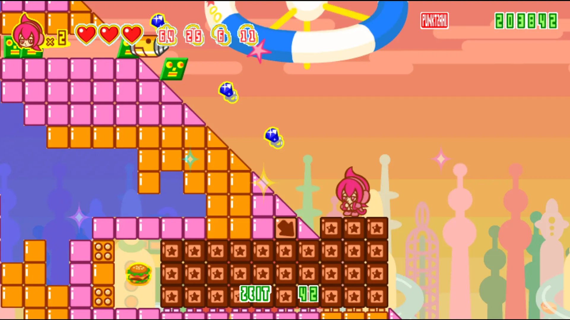 Hier erscheinen, neben späten Spielhallen-Perlen wie "Raiden III/IV", dem unterschätzten "Homura" und der Arcade-Version von meinem aktuellen Baller-Liebling "Trouble Witches Final!" auch das hier besprochene "Spica Adventure". Die Titelheldin Spica, eine kleine Mary Poppins, springt hier in Seiten-Ansicht durch bonbonbunte Hüpfspiel-Welten. Die Optik ist dabei pastellig und, nunja, klotzig. Viele Strukturen bestehen aus Würfeln, die an "Mr. Driller" oder, ganz klassisch, "Tetris" erinnern. Ähnlich Bonbonsüß ist die Musik, die sich lieblich-düdelnd an die bunten Farben anschließt, ohne lange im Gedächtnis zu bleiben.